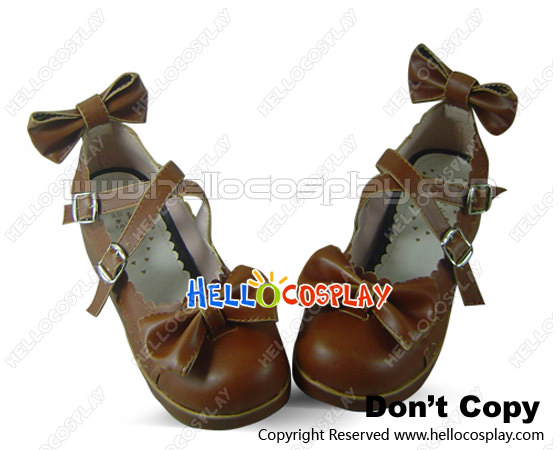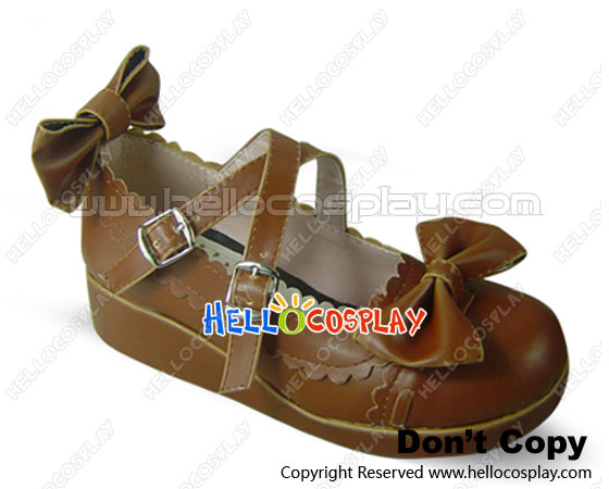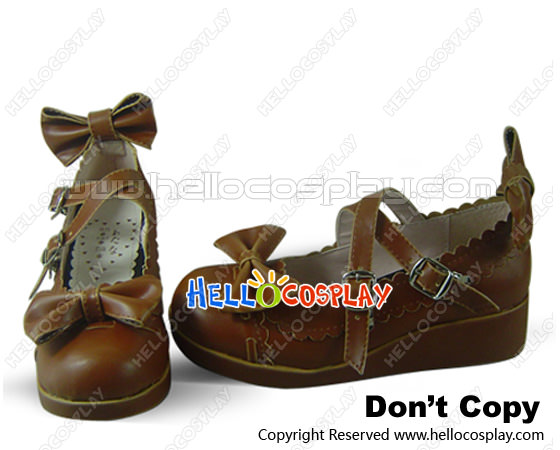 Brown PU Leather Ankle Strap Bow Wedge Lolita Shoes