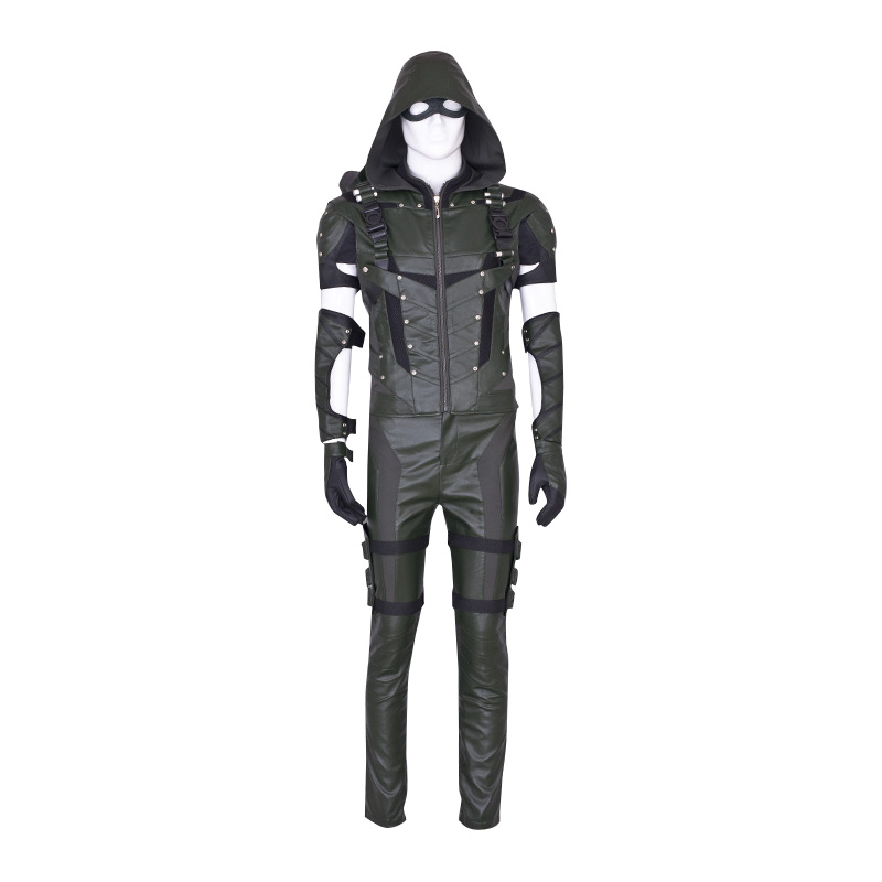 Top, shirt, pants, gloves, quiver, armbands, leggings and eye patch are all included in this combat uniform weared by Oliver Queen in Green Arrow Season 4. Top with hoodie designed according to the movie and TV. The top’s lining has pattern tread, armbands, shoe covers and eye patch workmanship is very exquisite. Green Arrow is a fictional superhero who appears in comic books published by DC Comics.