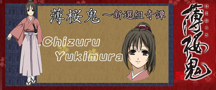 Chizuru Yukimura (雪村 千鶴 Yukimura Chizuru) is the main female protagonist in the Hakuōki Shinsengumi Kitan series. She is the narrator of the anime and games. She is a pure-blooded oni, or demon, and the only female in the Shinsengumi.