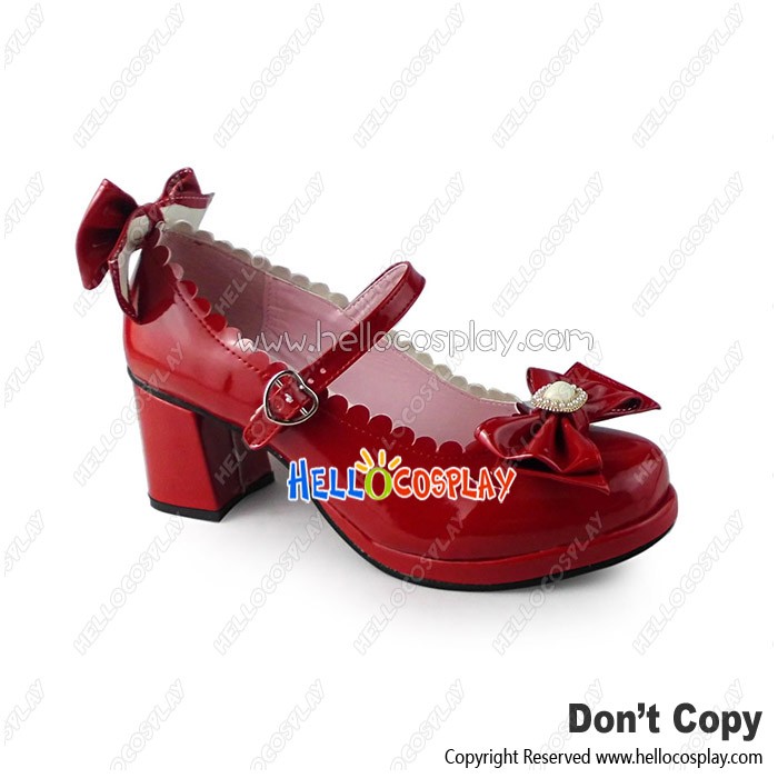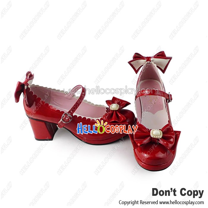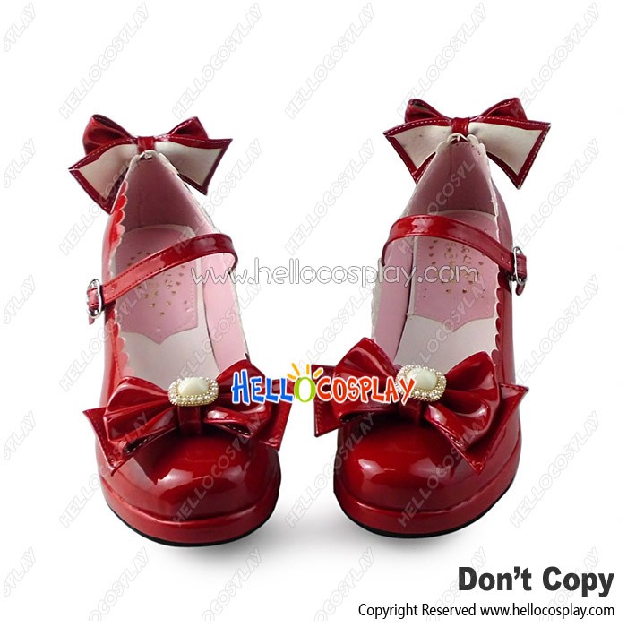 Lolita Shoes Red Mirror Chunky Bows Princess Lace Instep Strap