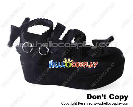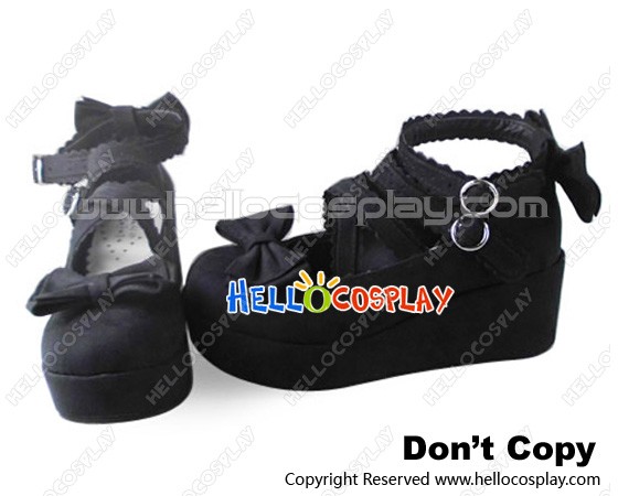 Princess Lolita Shoes Platform Black Suede Ankle Straps Lace Buckles Bows