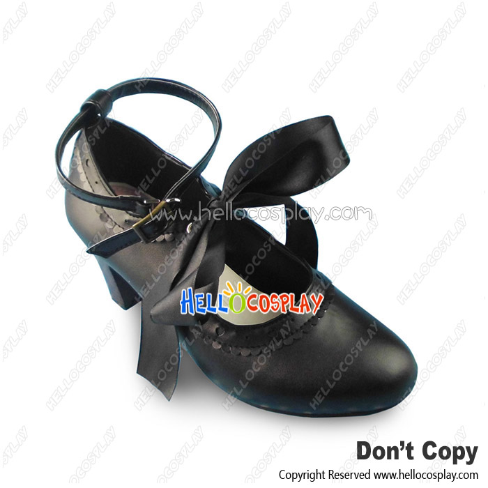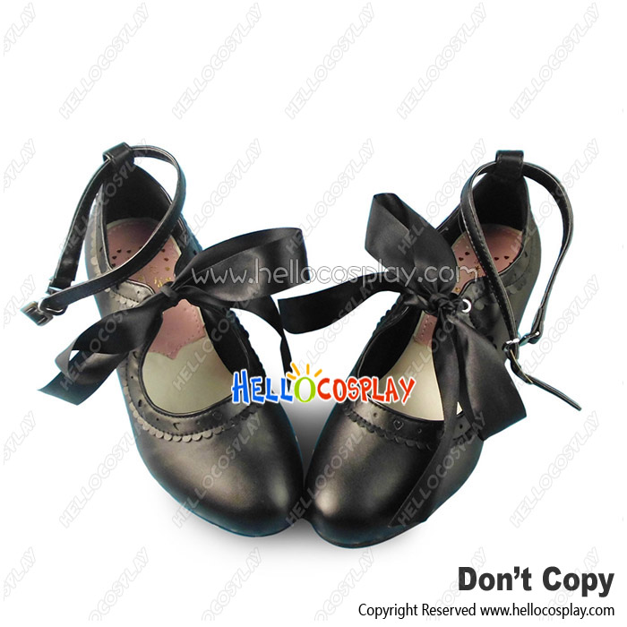 Sweet Lolita Shoes Matte Black Ruffle Ribbon Bow Lace Ankle Strap