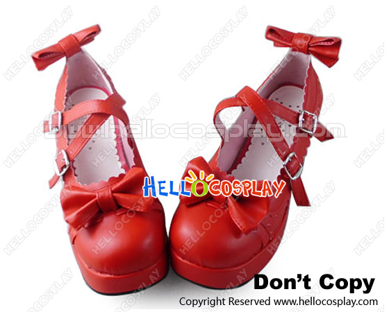 Sweet Lolita Shoes Red Matte Chunky Crossing Straps Lace Bows
