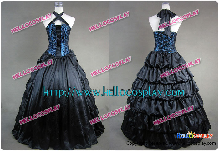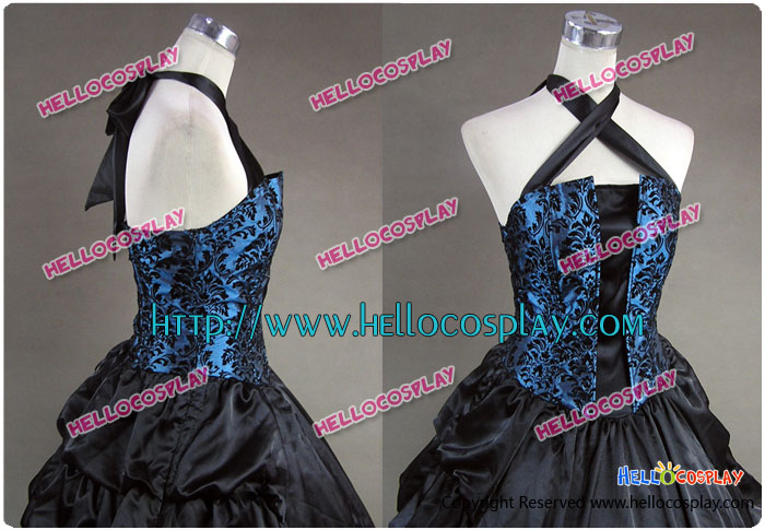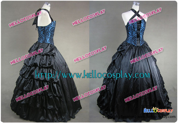 Victorian Gothic Satin Brocaded Frill Dress Gown Prom Cosplay