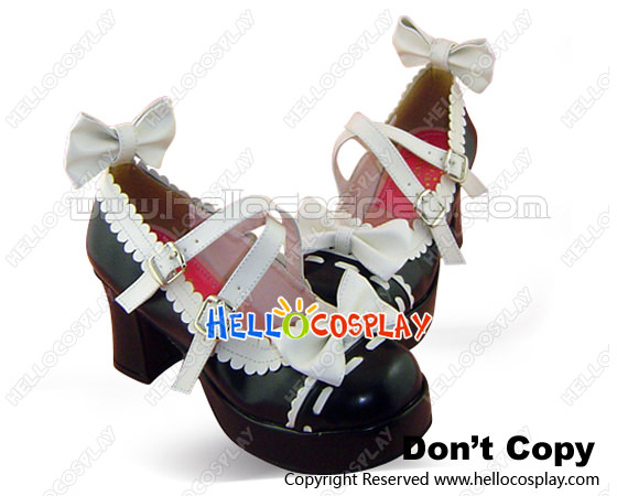 White Lace Bow Crisscross Black PU Leather Chunky Heel Shoes