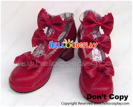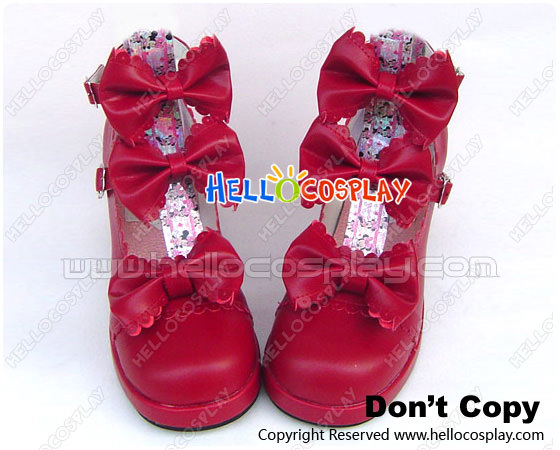 Wine Red Three Bows Ruffle Chunky Princess Lolita Shoes